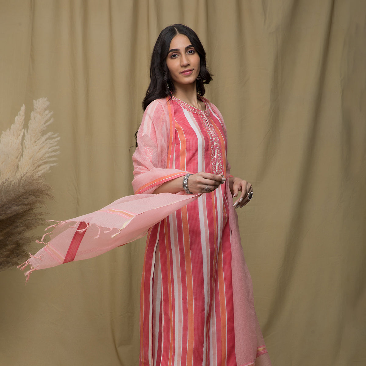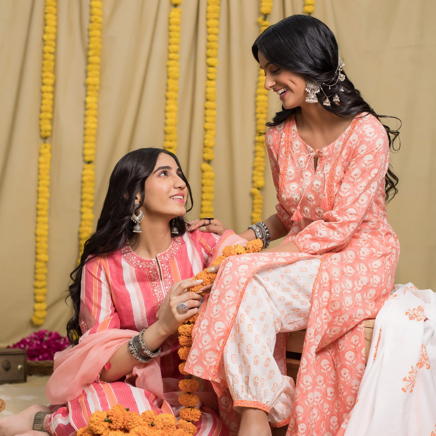 Hansika Motwani in Peach Silk Chanderi Block Printed & Embroidered Suit Set